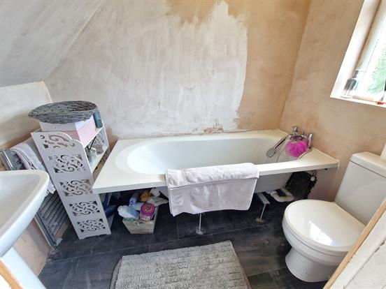 Extractor fan, UPVC double-glazed obscured window, panelled bath with mixer tap andshower attachment, closed coupled WC, pedestal sink with mixer tap, chrome heated towel rail and tile effect vinyl flooring.