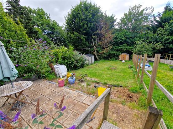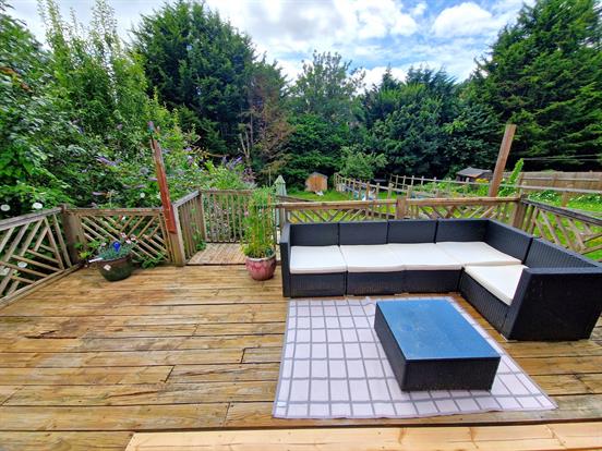 A spacious rear garden fully enclosed by fenced, mostly laid to lawn with decking area and patio. There is also a wooden shed.