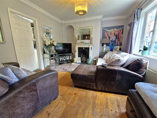 A good sized living room with ceiling rose, ornate coving, UPVC double-glazed window, double radiator, TV point, a feature fireplace and real wood flooring.