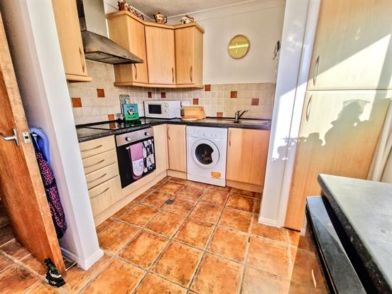 Kitchen:The well-planned kitchen is fitted with a range of base and wall units, an electric oven with hob and extractor, and tiled splashbacks. Under counter space and plumbing for a washing machine, plus room for a floor-standing fridge and freezer. A practical storage cupboard houses the gas combi boiler. The side-facing window brings in natural light. The feature bannister overlooks the living room with steps leading down, giving the space a unique and open feel.