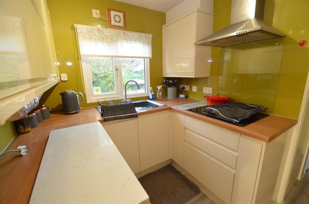 UPVC double glazed window to rear elevation, white wall, drawer and base units, wood effect worktop, stainless steel single bowl sink with drainer and mixer tap, built in electric hob with overhead extractor, built in mid height oven and microwave, space for freestanding fridge freezer, extractor fan, ceiling light point and wood effect vinyl flooring.