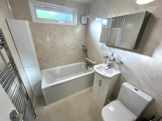 Bathroom: A modern and newly fitted bathroom comprising a panelled bath with mixer tap and shower attachment, vanity basin, close coupled WC, fitted storage cupboards, chrome heated towel rail, upvc double glazed obscure glass window, extractor fan and vinyl flooring.