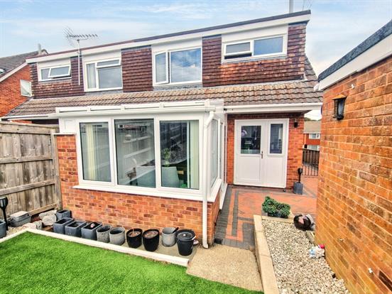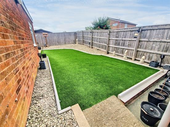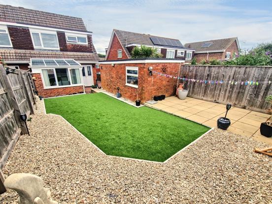 Rear Garden: A well maintained south facing rear garden, fully enclosed by wooden fencing, side access with brindle block paving, stone chippings, paved patio for seating and artificial grass, outside sensor light.