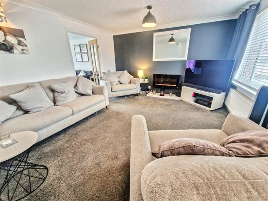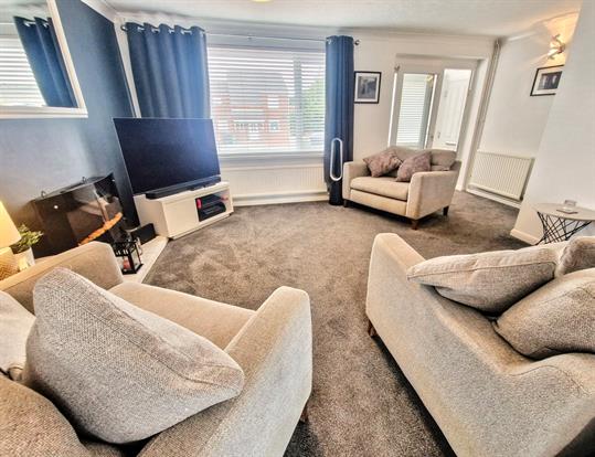 Living Room: A good sized living room with 2 radiators, under stairs storage cupboard, upvc double glazed window to front, wall lights, coving, ceiling light point and carpeted flooring. Door to stairs and double doors leading to kitchen/diner.