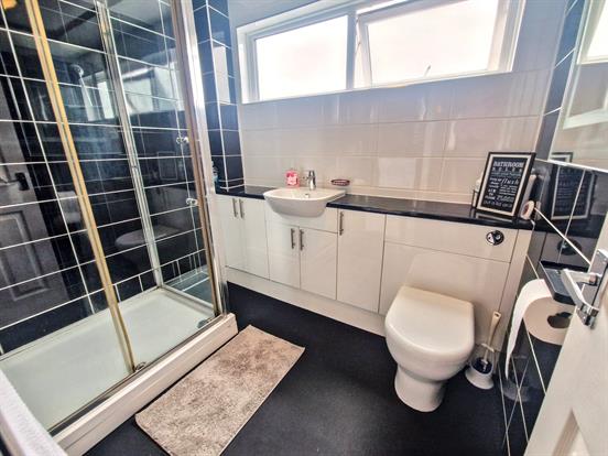 Shower Room: Modern fitted shower room with walk in shower cubicle, vanity basin, concealed cistern WC, storage cupboards, chrome heated towel rail, upvc double glazed obscured glass window, ceiling light point and vinyl flooring.