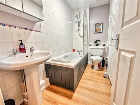 Fitted white bathroom suite comprising of a panelled bath with electric shower over, shower screen, partially tiled walls, WC, pedestal sink, laminate flooring and an extractor fan. There is also a wall-mounted mirrored cabinet, radiator and an airing cupboard that houses a hot water tank and has shelving.