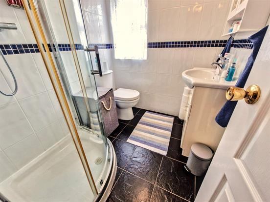 Shower Room: Modern fitted shiwer room with single corner shower (mains powered), close coupled WC, vanity wash hand basin, white heated towel rail, UPVC double glazed obscure window, tiled walls and tiled effect vinyl flooring.