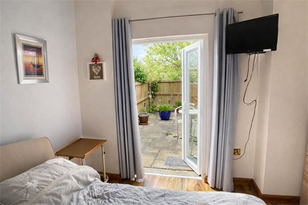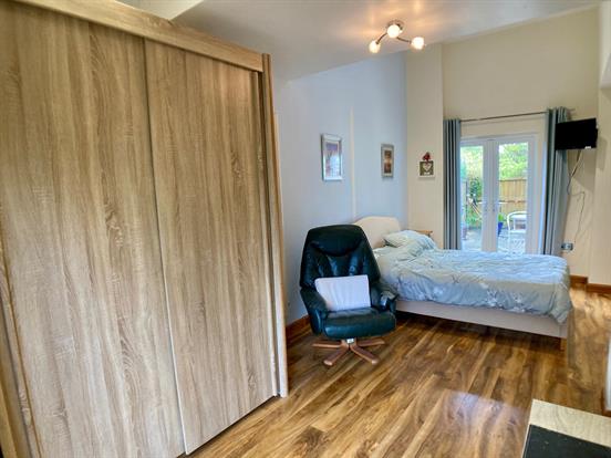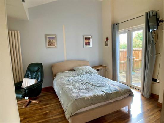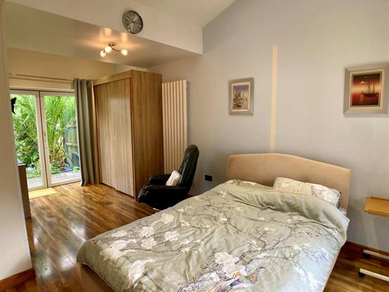 This bright and spacious bedroom enjoys its own private courtyard patio and access to the main rear garden via French doors. There is space for a king size bed and additional furniture, with radiator and laid to laminate flooring.