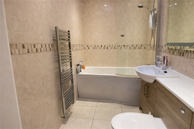 Modern white suite with shower over bath, close coupled WC, vanity basin storage, heated towel rail and tiled floor.