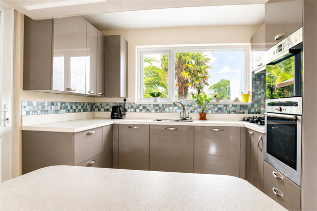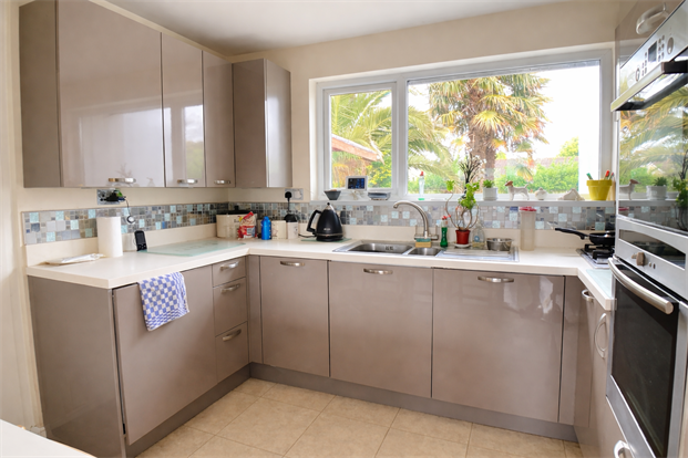 Enjoying views over the garden from the uPVC double glazed window. A modern kitchen with integrated electric oven, integrated, fridge/freezer, square edge worktop, gas hob, stainless steel single bowl sink with mixer tap, tiled splash back and tiled flooring.