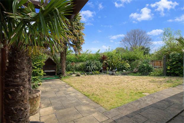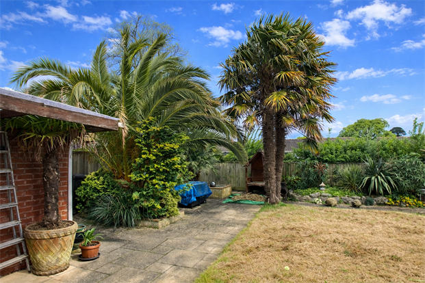 Enclosed with wooden fencing, laid to lawn and paving. A beautiful space offers a Mediterranean feel with large palm trees, water feature and ornamental pond.