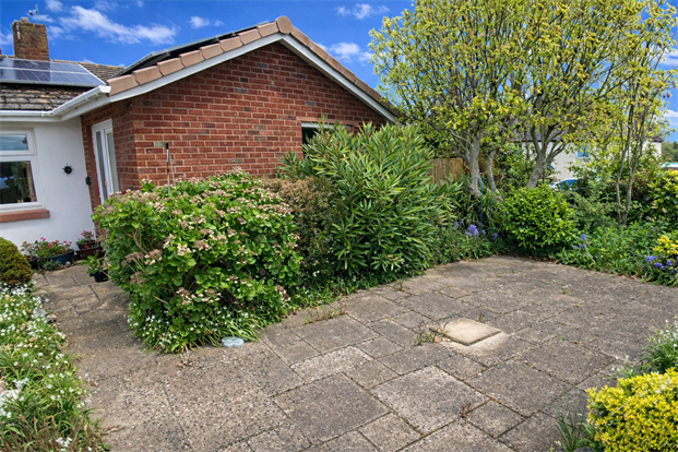 Front garden: laid to patio and surrounded by mature shrubs and bushes.