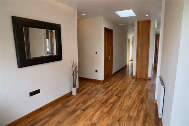 Large hallway with storage cupboards and laminate flooring.