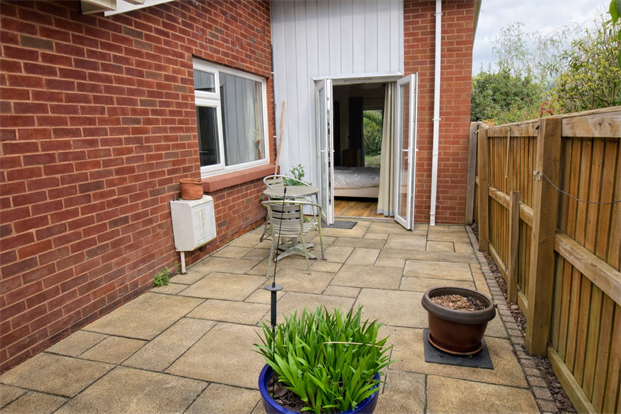 Primary courtyard garden: French doors lead to a private patio with ample space to sit and relax, a gate offers access to the front of the property.
