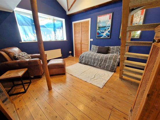 vaulted ceiling with mezzanine level, upvc double glazed window, single radiator, loft storage and real wood flooring.