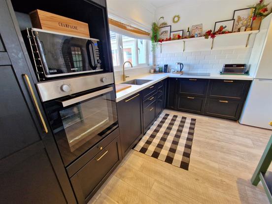 Downlights, upvc double glazed window, charcoal handless kitchen with built in dishwasher, built in hidden drawers, built in fan oven space for built in microwave, space for free standing fridge freezer, square edge worktop, ceramic hob, stainless steel single bowl sink with mixer tap, part tiled walls and wood effect vinyl.
