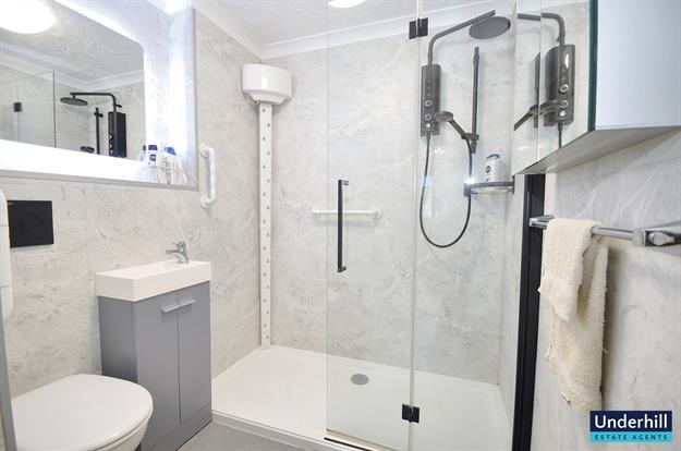 Shower Room:A modern, fully fitted shower room finished with easy-to-clean shower boarding. Features include a large walk-in shower cubicle with a glass screen, rainfall and handheld shower heads, wall-mounted WC, inset backlit mirror, and a sink with fitted storage beneath. An electric body dryer and wall-mounted heater complete the room.