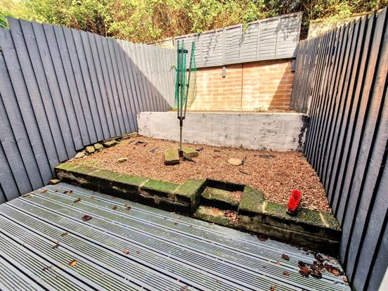 Fully enclosed rear garden with fencing, 2 tier garden with stone chippings and a small decked area for seating.
