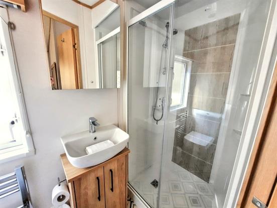 Modern fitted shower room with extractor fan, upvc double glazed obscure glass window, chrome heated towel rail, close coupled WC, vanity basin, shower and vinyl flooring.