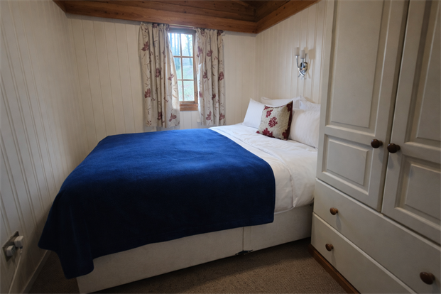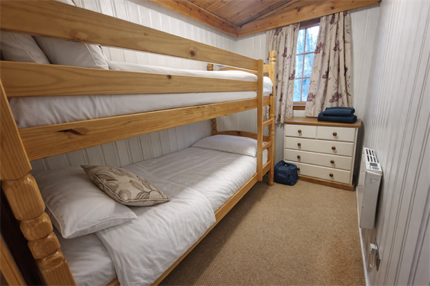 Bedroom Two: Single bedroom with bunk beds, wooden double-glazed window, electric heater and carpeted flooring.