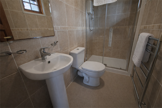 Bathroom: Wooden double-glazed window, closed coupled WC, pedestal sink, double shower enclosure, tiled floor to ceiling and tile effect vinyl flooring.
