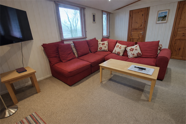 Living Room: A good sized living area with downlights, two wooden double-glazed window with fantastic views over the surrounding countryside, TV point and carpeted flooring.