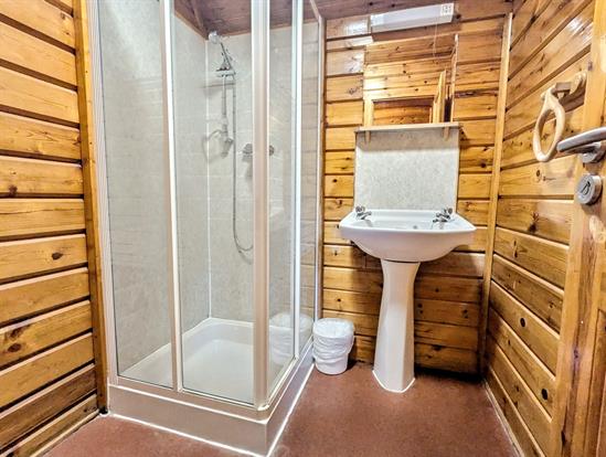 A shower room with a pedestal sink, shower cubicle (mains-powered shower), double-glazed window and wood effect vinyl flooring. Next door in a separate room is a closed coupled WC.