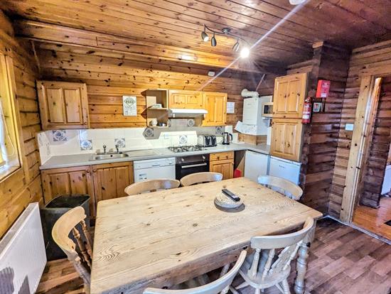 A fitted kitchen with a range of wall and base units, roll-top worktops, single bowl stainless steel sink with mixer tap and drainer, built-in fan oven and 4-ring gas hob with extractor over, free-standing dishwasher, free-standing fridge, free-standing washing machine, tiled walls to splash prone areas and wood effect vinyl flooring.
