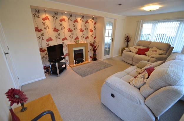 A spacious living room with UPVC double glazed door and window to rear elevation, UPVC double glazed bay window to side elevation, electric feature fireplace, double radiator, TV aerial point, spotlights, two ceiling light points and carpeted flooring.