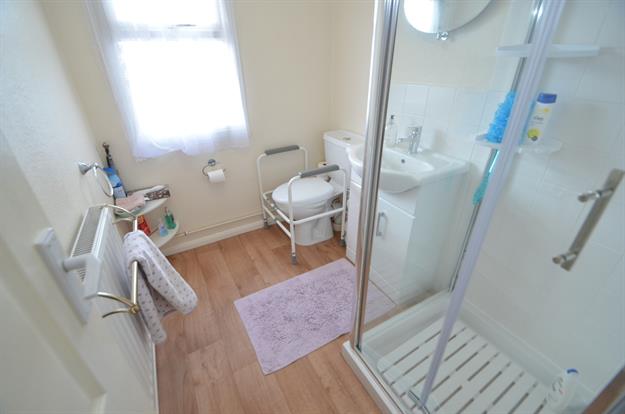 Modern fitted shower room with single enclosure shower, low level WC, semi pedestal sink with vanity unit, UPVC obscured double glazed window to front elevation, ceiling light point, single radiator, walls tiled to splash prone areas and laminate flooring.