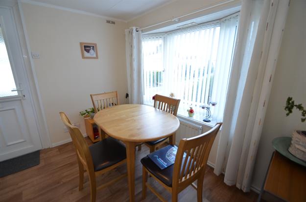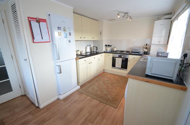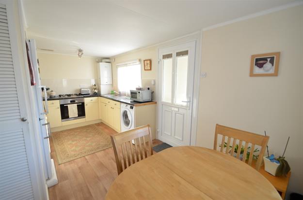 A spacious kitchen/diner with cream wall, drawer and base units, granite effect worktop, stainless steel single bowl sink with mixer tap and drainer, built in gas hob and oven, Worcester combi boiler, walls tiled to splash prone areas, space for freestanding washing machine and fridge freezer, built in storage cupboard, UPVC double glazed door and window to front elevation, UPVC double glazed bay window to side elevation, two ceiling light points, double radiator and laminate flooring.
