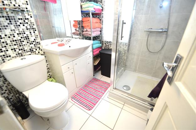 Fitted bathroom with single shower, close coupled WC, vanity basin, chrome heated towel rail, UPVC double glazed obscure window, partially tiled walls and tiled flooring.