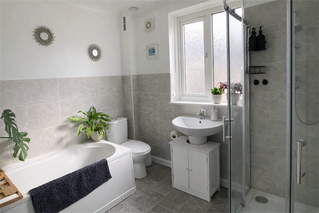 Bathroom: The bathroom features a modern white suite that includes a pedestal sink, W/C, panelled bathtub, separate shower cubicle and a heated towel rail. The walls are partially tiled around the bath and sink, the floor is vinyl, and there is a large opaque uPVC window that views to the rear of the property.