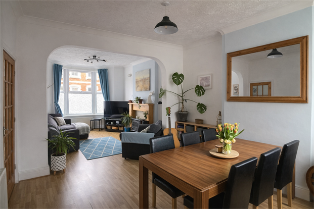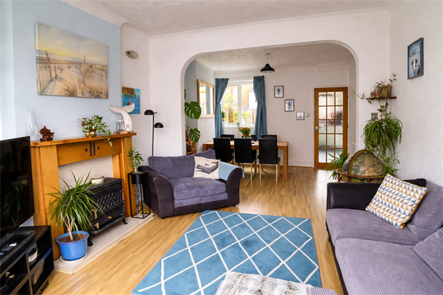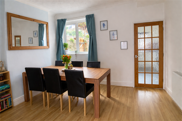 Living/Dining Room: This is a large, open space that runs from the front to the back of the property. There are two large uPVC windows viewing both the front and rear gardens, fireplace with electric flame effect heater, radiator, and laminate floors. The dining area offers space for a 6-seater dining table.