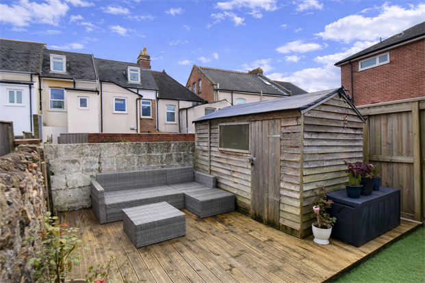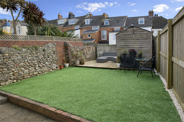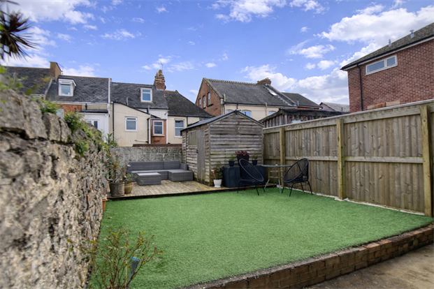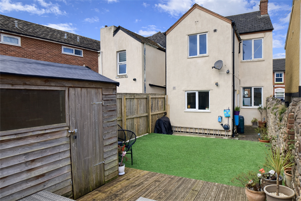 Rear Garden: The rear garden offers a great entertaining space with patio leading to a slightly raised area laid to faux grass and a decked seating area. There is also a useful storage shed and gate leading out to the front of the property.