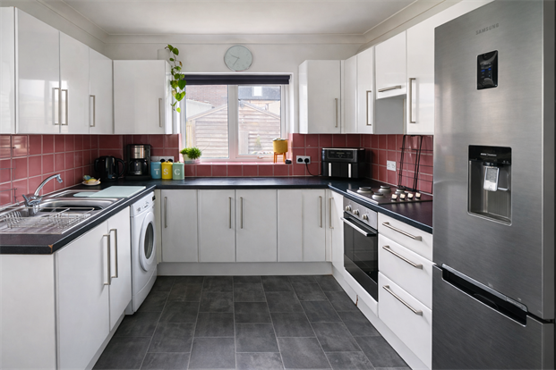 Kitchen: The kitchen features a variety of modern white high gloss base and wall units, and features a stainless steel single sink and drainer, roll-top work surfaces, tiled splashbacks, an extractor fan over a integrated electric oven with gas hob, space for washing machine and freestanding fridge freezer. Under stairs storage cupboard, vinyl flooring, uPVC window viewing to the rear garden and uPVC door leading to the rear garden.