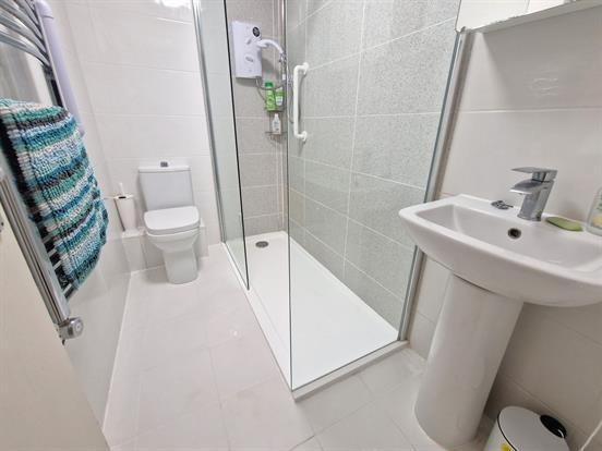 Large double electric shower, chrome radiator, close coupled WC, pedestal sink, tiled wall to ceiling and tiled flooring.