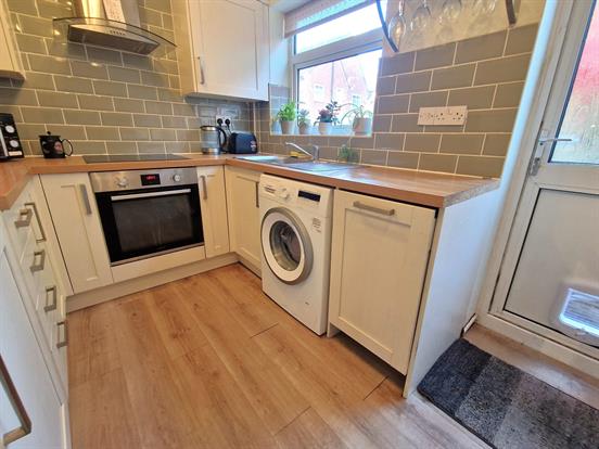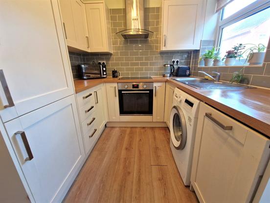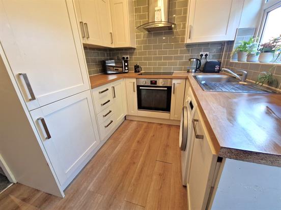 Spotlights, upvc double glazed window, extractor fan, wall and base kitchen units, built in fan oven, built in slimline dishwasher, built in fridge freezer, space for free standing washing machine, roll top worktop, electric hob, stainless steel single bowl sink and laminate flooring.