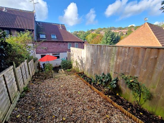 Enclosed rear garden with fencing and rear gate access, 2 tier garden laid to paving and stone. Raised flower beds.