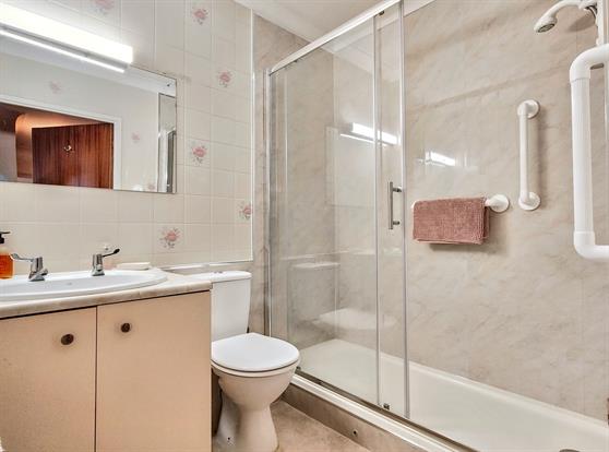 Shower Room: Walk in shower cubicle (electrically powered), close coupled WC, sink with vanity unit, coving to ceiling, wall heater, fully tiled walls and vinyl flooring.