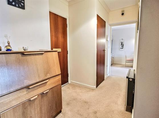 Hallway: Wooden door to front elevation, telephone intercom, emergency pull handle, built in storage cupboard, carpeted flooring and doors leading to: