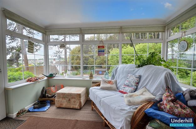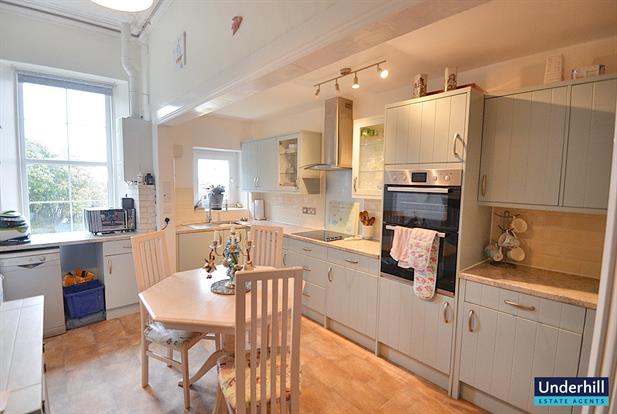 The large living room is a spacious, airy retreat boasting captivating sea views and a warm log burner, perfect for relaxation. Original features such as the shadow coving and picture rail add to the grandeur of the space.