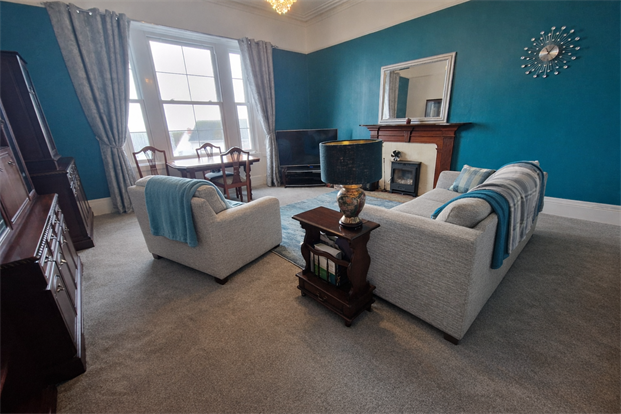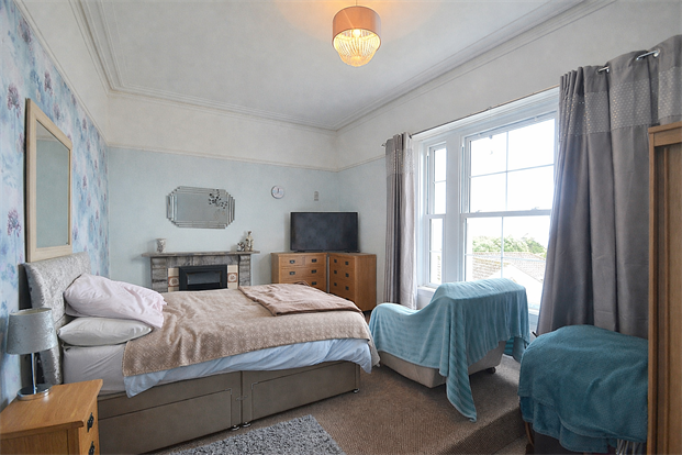 The large living room is a spacious, airy retreat boasting captivating sea views and a warm log burner, perfect for relaxation. Original features such as the shadow coving and picture rail add to the grandeur of the space.