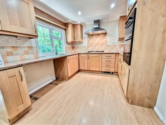 Kitchen: Modern fitted kitchen with wood effect wall, drawer, base and larder units, granite effect worktop, walls tiled to splash prone areas, stainless steel one and a half bowl sink with mixer tap and drainer, built in 5 ring gas hob with overhead extractor, oven, space for fridge/freezer, space for washing machine, space for dishwasher, UPVC double glazed window and door to side elevation, coving to ceiling, single radiator, ceiling light point and laminate flooring.