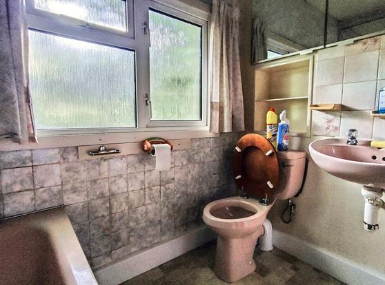 Bathroom: Upvc double glazed window, panelled bath, low level WC, wash hand basin and vinyl flooring.