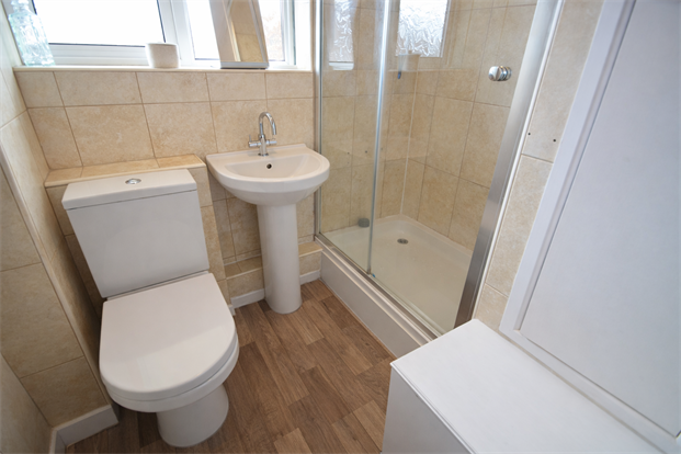 A modern fitted shower room with double enclosure shower, low level WC, pedestal sink, UPVC obscured double glazed window to fore, built in storage cupboard, ceiling light point, walls tiled to splash prone areas and vinyl flooring.