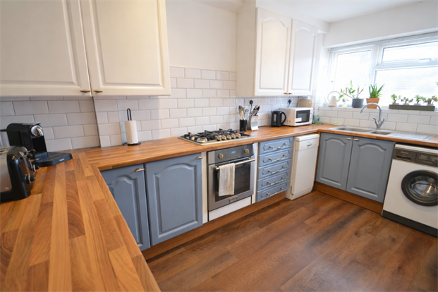 UPVC double glazed window to fore, white and blue wall, drawer and base units, wood effect worktop, walls tiled to splash prone areas, one and a half bowl stainless steel sink with drainer and mixer tap, built in gas hob and electirc oven, space for freestanding washing machine, slimline dishwasher and fridge freezer, ceiling spotlights, built in storage cupboard, and karndean flooring.