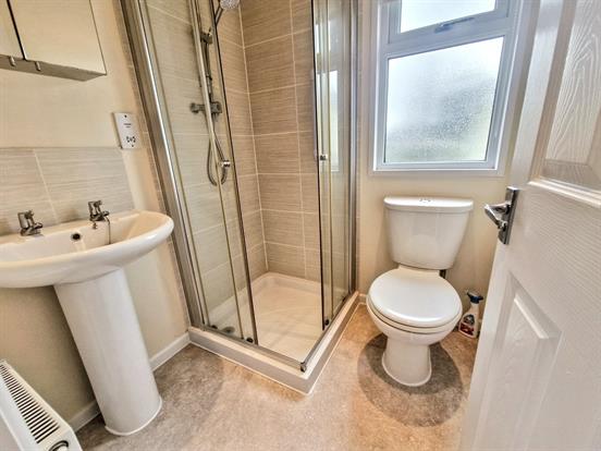 Ensuite Shower Room: Modern fitted shower room with single shower cubicle, close coupled WC, pedestal sink, extractor fan, upvc double glazed obscured glass to side, walls tiled to splash prone areas and vinyl flooring