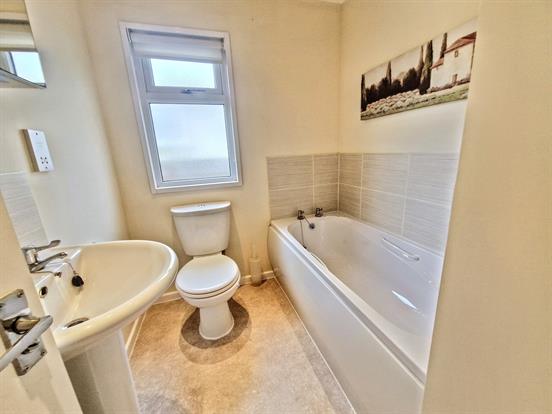 Bathroom: Modern fitted bathroom with panelled bath, pedestal sink, close coupled WC, shaver socket, radiator, upvc double glazed obscured glass window to side, walls tiled to splash prone areas and vinyl flooring.