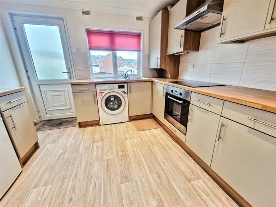 Kitchen: A modern fitted kitchen with a range of taupe wall and base units, work surfaces, tiled splash backs, stainless steel single bowl sink with drainer and mixer tap, space and plumbing for washing machine, built in electric oven, electric hob with extractor over, space for free standing fridge freezer, storage cupboard, combi boiler, upvc double glazed window to side, upvc double glazed obscured glass door to side and wood effect vinyl flooring.